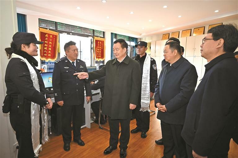 调研中,王君正强调,全区各地各部门要深刻认识维稳工作的重要性,坚持把维护稳定作为第一位的政治任务,时刻绷紧维护稳定这根弦,科学把握形势,增强责任感使命感,树牢底线思维,坚持问题导向,补齐工作短板,扎实做好各项工作,以实际行动坚定拥护“两个确立”、坚决做到“两个维护”。要全面落实维护社会稳定责任制,警钟长鸣、警惕常在,强化忧患意识、风险意识,坚决克服麻痹思想、厌战情绪、侥幸心理、松劲心态,以科学化机制和常态化、法治化理念,把维稳工作做在日常、做到经常、落实在基层,牢牢掌握维稳工作主动权。要坚决守住政治安全底线,坚持以铸牢中华民族共同体意识为主线,扎实推进中华民族共同体建设,持续开展“四大工程”“六项行动”,加强宗教事务治理法治化,深入开展反分裂斗争,大力推进智慧边防建设,坚决维护国家核心利益。要强化社会治安整体防控,完善维稳指挥调度体系,提高信息技术应用水平,建设好使用好“一张网、一平台”,加强实战化演练和随机性调度,发挥好各级综治中心作用,推动防控力量向基层下沉、向一线延伸,依法严厉打击各类违法犯罪活动,确保社会大局持续和谐稳定。要加快推进社会治理法治化,不断提高依法治藏水平,树立法治思维、提升法治能力,严格规范公正文明执法,保护合法、打击非法,在全社会营造自觉守法、办事依法、遇事找法、解决问题用法、化解矛盾靠法的浓厚氛围。要深化风险隐患排查化解,坚持关口前移、源头治理,着力抓好“三个环节”、提升“三种能力”、建立“三项机制”,聚焦重点领域、重要节点、关键环节,用心用情解决群众急难愁盼问题,切实把矛盾纠纷化解在基层、消除在萌芽状态。要扎实做好公共安全工作,严格落实安全生产责任制,强化各类自然灾害监测预警,健全完善应急处置体系和各类应急预案,加强应急救援队伍建设,不断提升应急处置的科学性、针对性和实效性,确保快速响应、高效处置、科学应对。